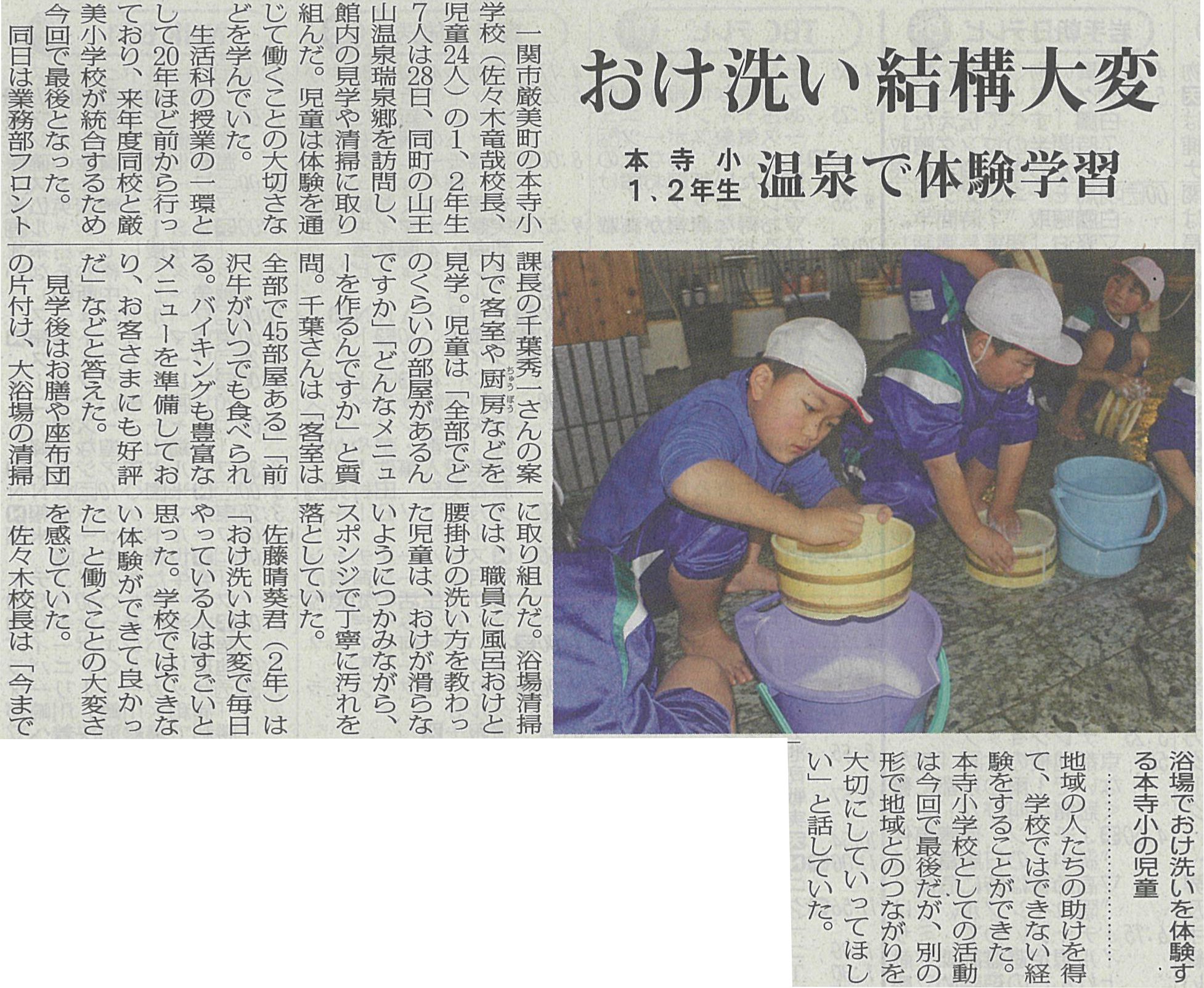 最後の体験学習 2017年11月29日 こんにちはフロントのC葉です 昨日は、地元の本寺小学校の生徒さんに温泉のお仕事体験をしてもらいました この体験学習がはじまって20年、本寺小学校は来年厳美小学校と併合するため、今年が最後です。 そう考えると、何か寂しいです。 いつもこの時期になると、「元気なお子さんたちとまた会えるっ♪」って、いつの間にか自分の糧になっていたんだなぁって、思い返してみたり・・・。 記事は本日の岩手日日さんからです。 本寺小学校の皆さん、残りの時間、たくさん楽しい思い出を作ってくださいね